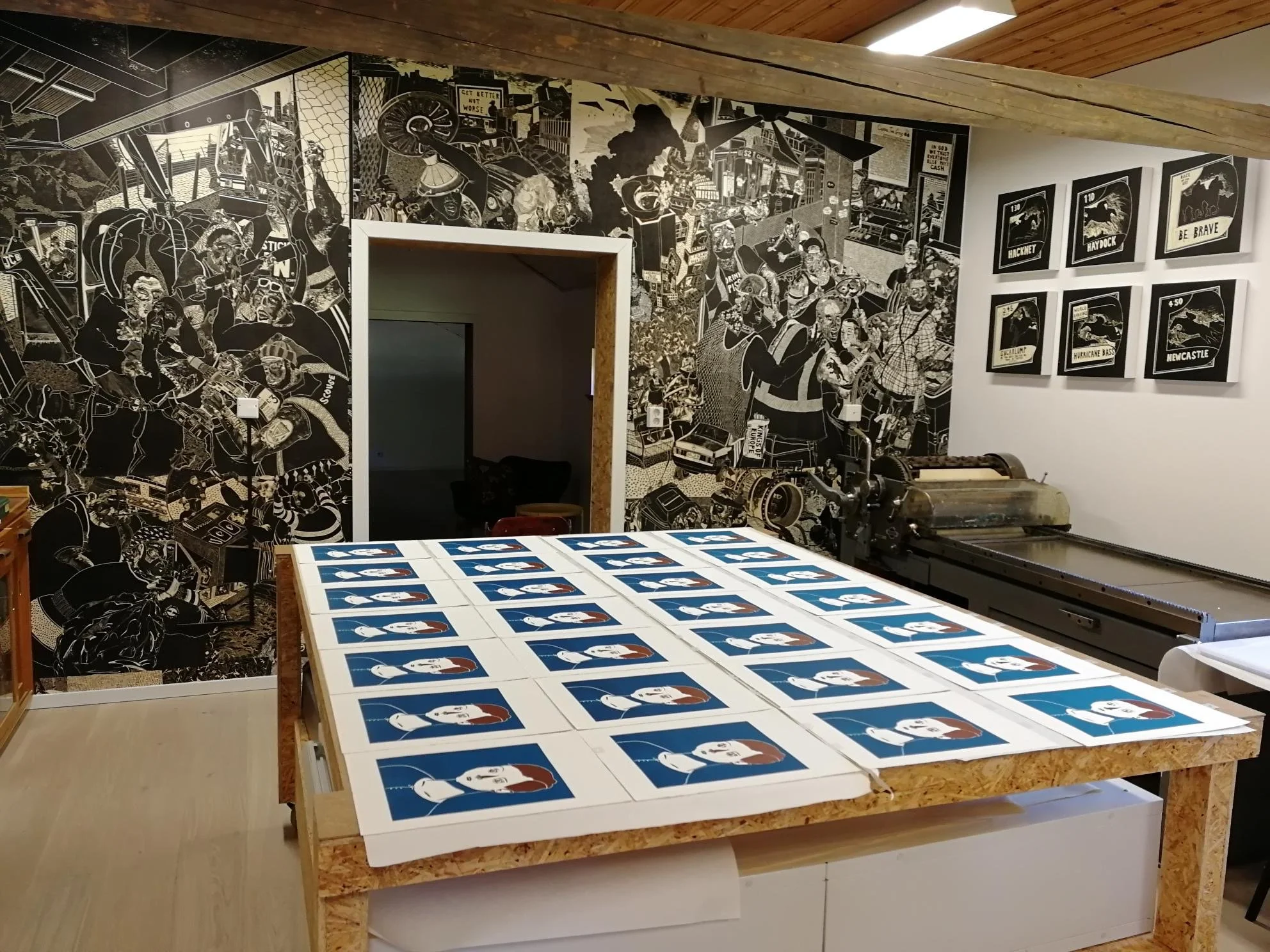 Reduction linocut prints drying waiting for the next colour layer to be added.